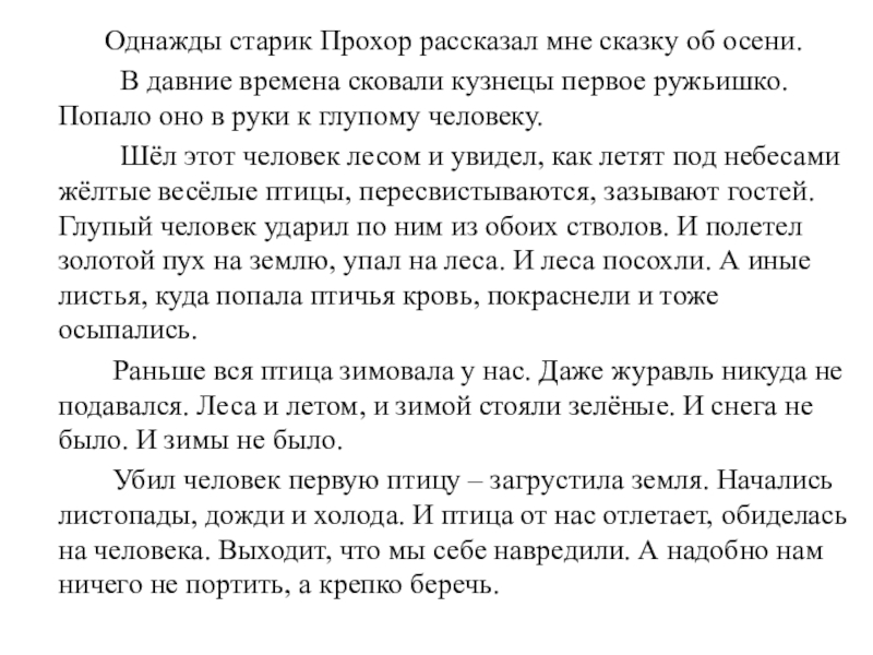 Убил человек первую птицу – загрустила земля. Начались листопады, дожди и холода. И птица от нас отлетает, обиделась на человека. Выходит, что мы себе навредили. А надобно нам ничего не портить, а крепко беречь.
