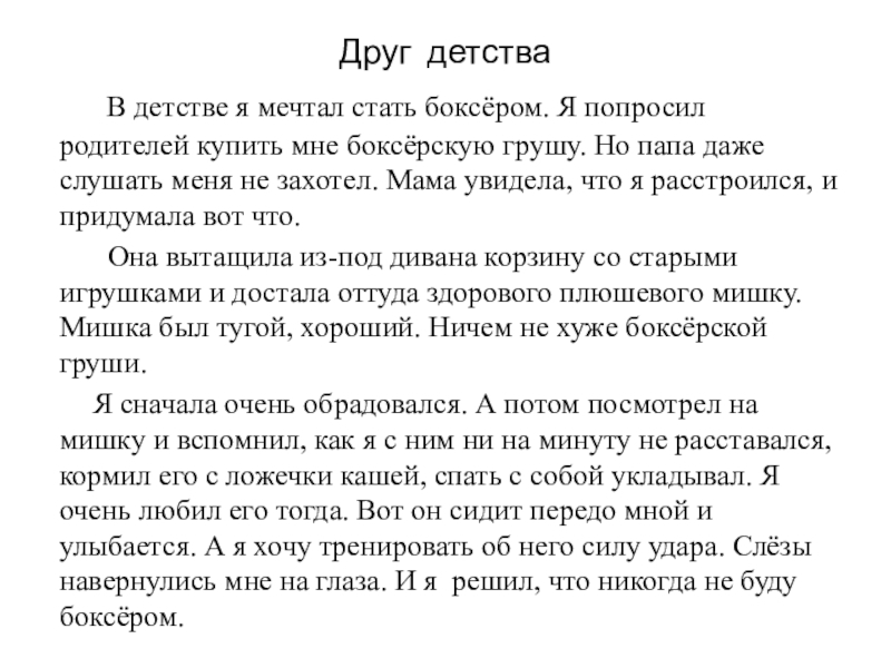 Я сначала очень обрадовался. А потом посмотрел на мишку и вспомнил, как я с ним ни на минуту не расставался, кормил его с ложечки кашей, спать с собой укладывал. Я очень любил его тогда. Вот он сидит передо мной и улыбается. А я хочу тренировать об него силу удара. Слёзы навернулись мне на глаза. И я решил, что никогда не буду боксёром.