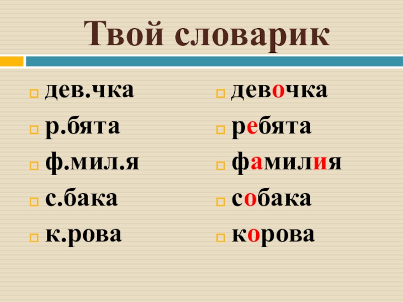 Твой словарикдев.чкар.бятаф.мил.яс.бакак.ровадевочкаребятафамилиясобакакорова