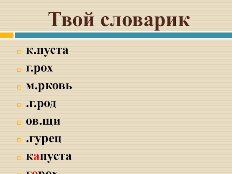 Твой словарикк.пуста  г.рохм.рковь.г.родов.щи.гурец  капустагорохморковьогородовощиогурец