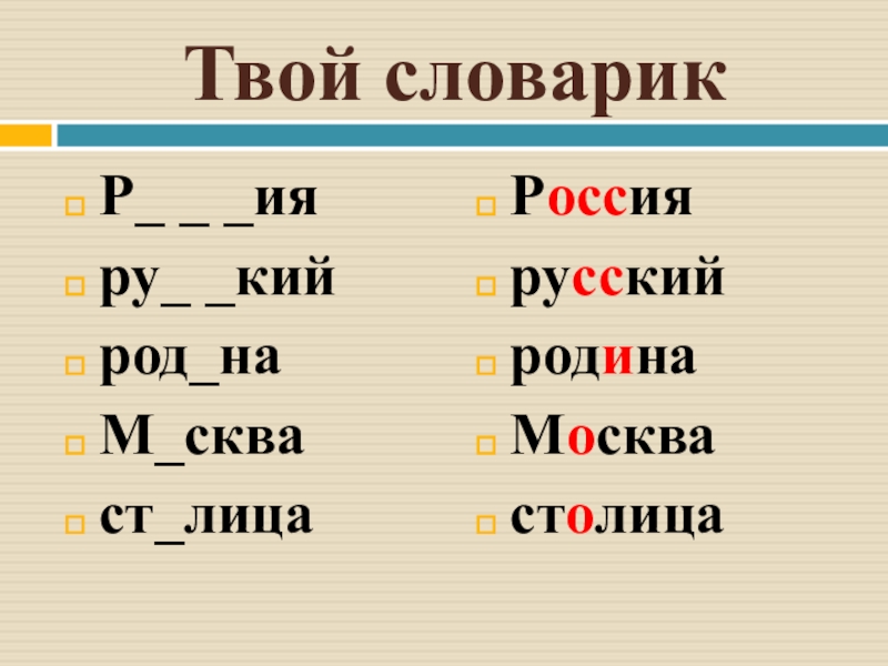 Твой словарикР_ _ _ияру_ _кийрод_наМ_скваст_лицаРоссиярусскийродинаМосквастолица
