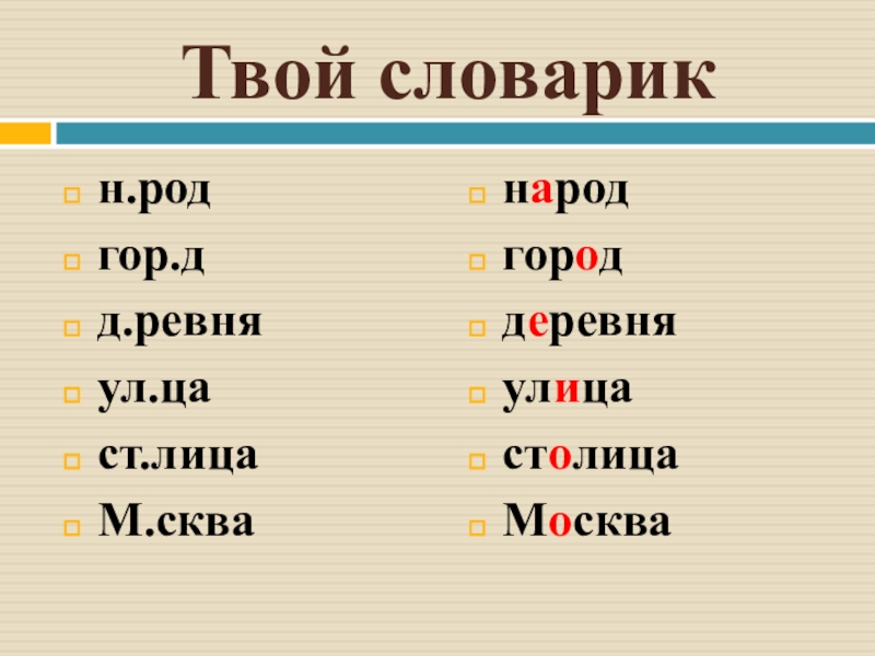 Твой словарикн.родгор.дд.ревняул.цаст.лицаМ.скванародгороддеревняулицастолицаМосква