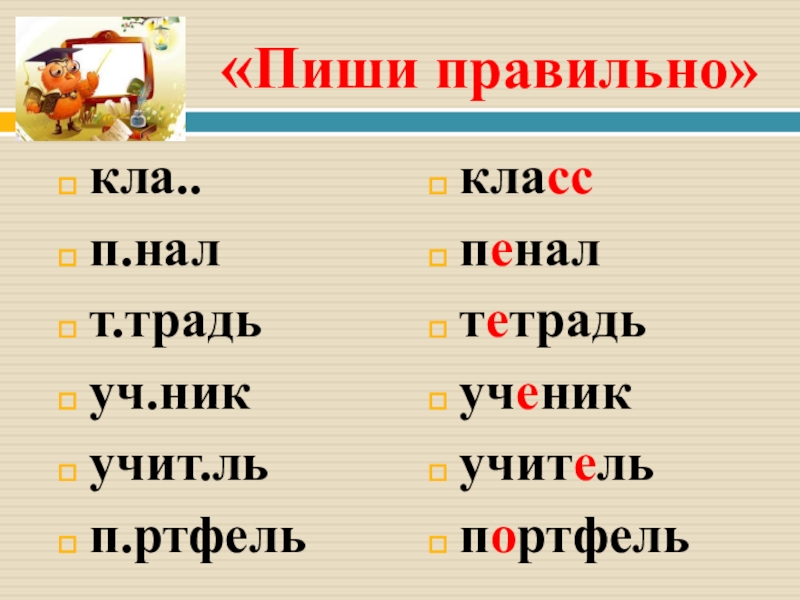 «Пиши правильно»кла..п.налт.традьуч.никучит.льп.ртфелькласс   пеналтетрадьученикучительпортфель