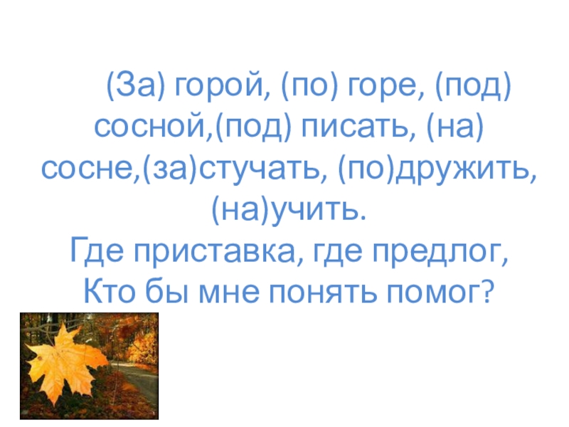 сосной,(под) писать, (на) сосне,(за)стучать, (по)дружить, (на)учить. Где приставка, где предлог, Кто бы мне понять помог?