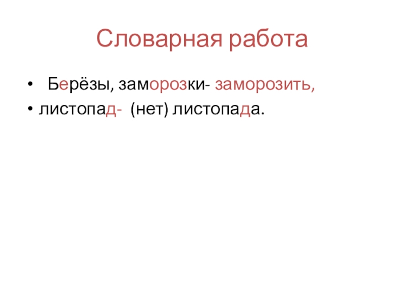 Словарная работа Берёзы, заморозки- заморозить, листопад- (нет) листопада.