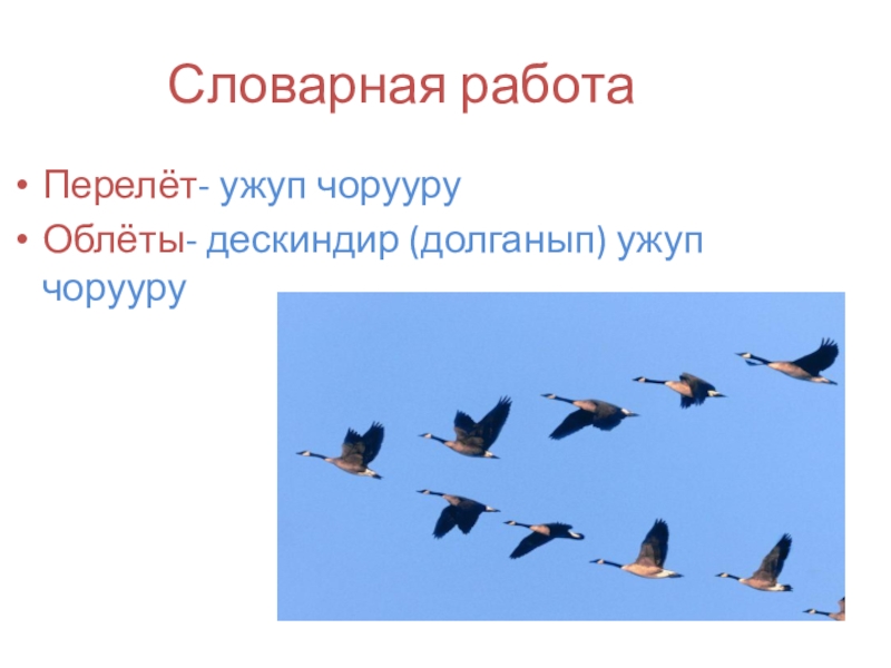 Словарная работаПерелёт- ужуп чорууруОблёты- дескиндир (долганып) ужуп чорууру