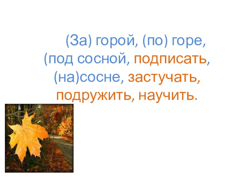 Слайд 5 (За) горой, (по) горе, (под сосной, подписать, (на)сосне,
