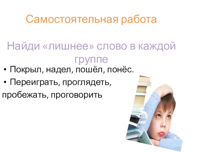 Самостоятельная работа  Найди «лишнее» слово в каждой группеПокрыл, надел, пошёл, понёс.Переиграть, проглядеть, пробежать,