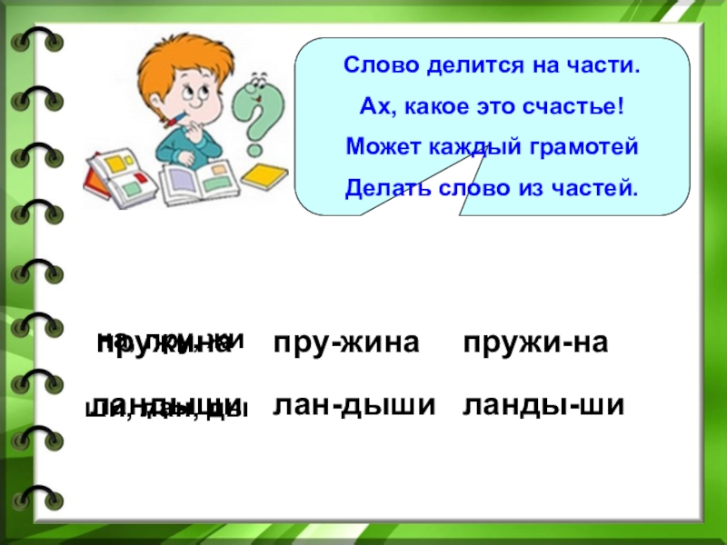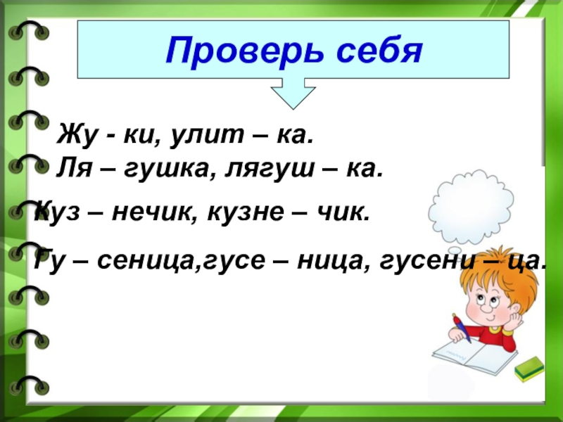 Гу – сеница,гусе – ница, гусени – ца.