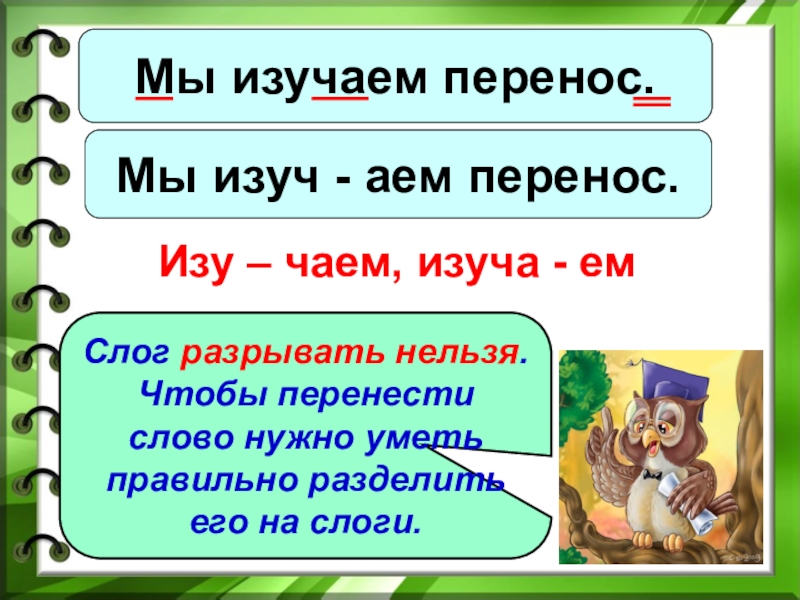 Слог разрывать нельзя. Чтобы перенести слово нужно уметь правильно разделить его на слоги.