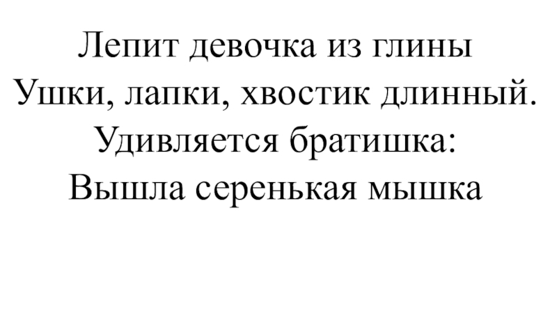 Лепит девочка из глиныУшки, лапки, хвостик длинный.Удивляется братишка:Вышла серенькая мышка