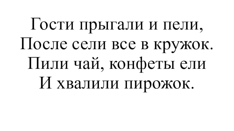 Гости прыгали и пели,После сели все в кружок.Пили чай, конфеты елиИ хвалили пирожок.