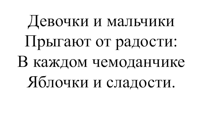Девочки и мальчикиПрыгают от радости:В каждом чемоданчикеЯблочки и сладости.
