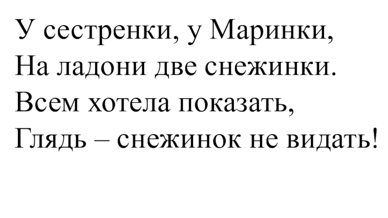 У сестренки, у Маринки,На ладони две снежинки.Всем хотела показать,Глядь – снежинок не видать!