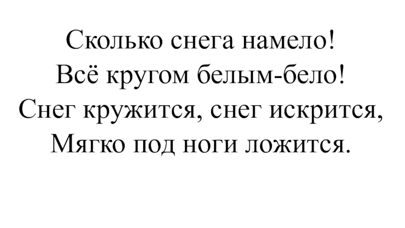 Сколько снега намело!Всё кругом белым-бело!Снег кружится, снег искрится,Мягко под ноги ложится.