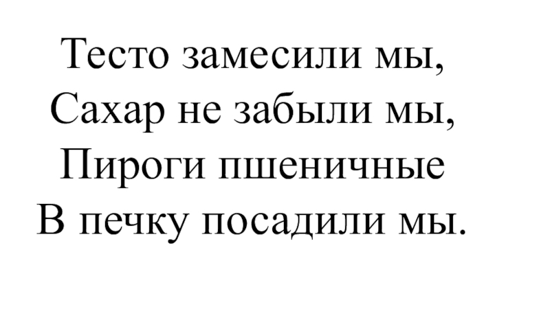 Тесто замесили мы, Сахар не забыли мы,Пироги пшеничныеВ печку посадили мы.