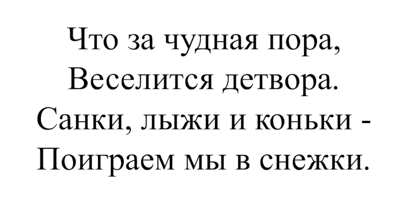 Что за чудная пора,Веселится детвора.Санки, лыжи и коньки -Поиграем мы в снежки.
