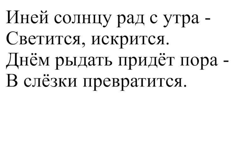 Иней солнцу рад с утра -Светится, искрится.Днём рыдать придёт пора -В слёзки превратится.