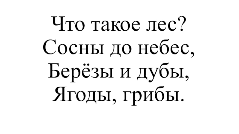 Что такое лес?Сосны до небес,Берёзы и дубы,Ягоды, грибы.