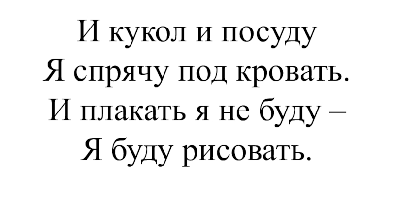 И кукол и посудуЯ спрячу под кровать.И плакать я не буду –Я буду рисовать.