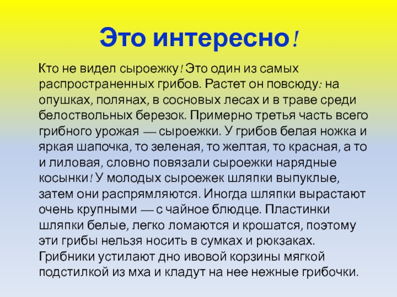 Это интересно!   Кто не видел сыроежку! Это один из самых распространенных грибов. Растет он повсюду: