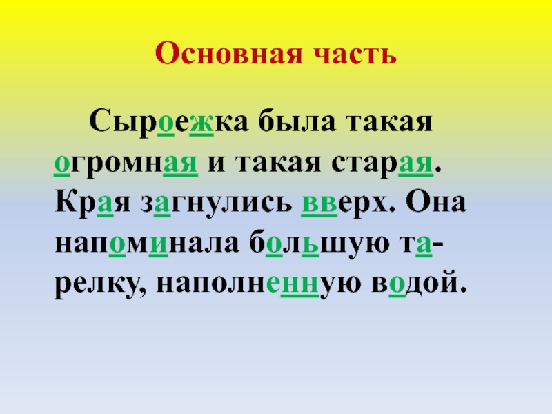 Основная часть  		Сыроежка была такая огромная и такая старая. Края загнулись вверх. Она напоминала большую та-релку,