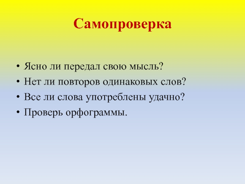 Самопроверка Ясно ли передал свою мысль?Нет ли повторов одинаковых слов?Все ли слова употреблены удачно?Проверь орфограммы.