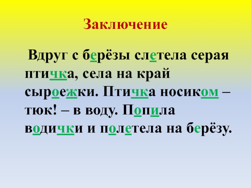 Заключение   	Вдруг с берёзы слетела серая птичка, села на край сыроежки. Птичка носиком – тюк!