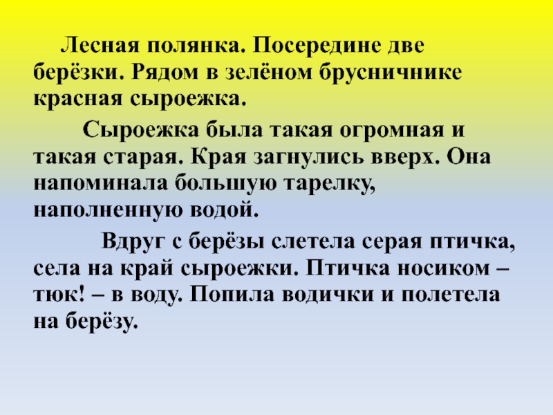 Вдруг с берёзы слетела серая птичка, села на край сыроежки. Птичка носиком – тюк! – в воду. Попила водички и полетела на берёзу.