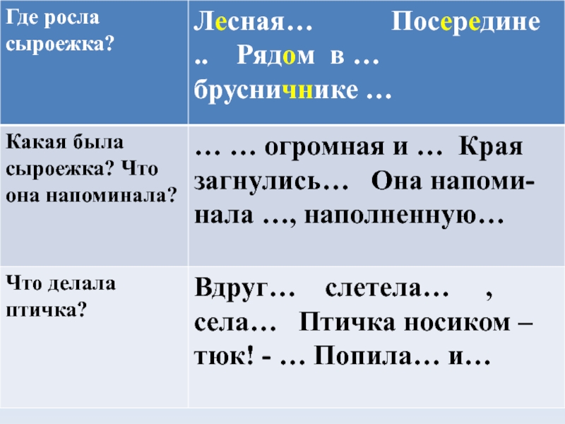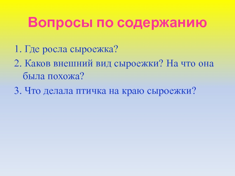 Вопросы по содержанию1. Где росла сыроежка?2. Каков внешний вид сыроежки? На что она была похожа?3. Что делала