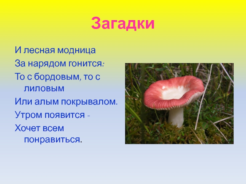 ЗагадкиИ лесная модницаЗа нарядом гонится:То с бордовым, то с лиловымИли алым покрывалом.Утром появится - Хочет всем понравиться.