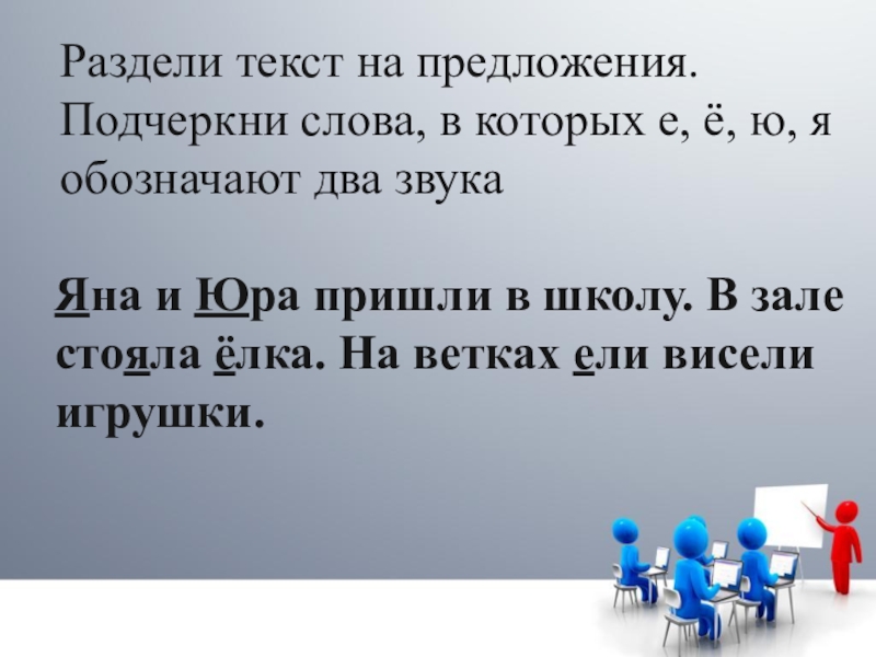 Яна и Юра пришли в школу в зале стояла ёлка на ветках ели висели игрушки