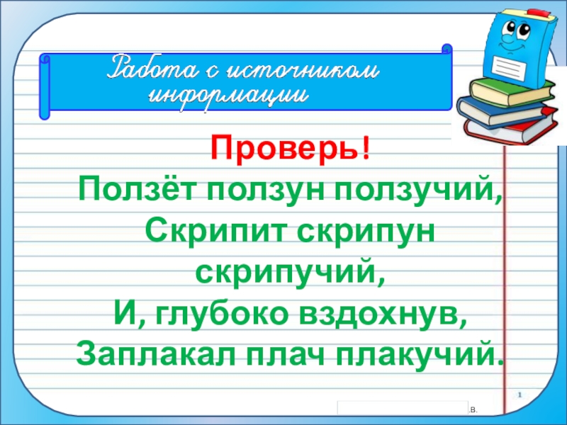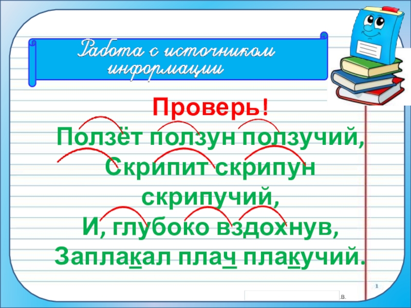 Проверь!Ползёт ползун ползучий,Скрипит скрипун скрипучий,И, глубоко вздохнув, Заплакал плач плакучий.