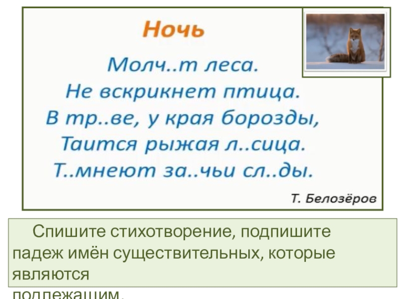 Спишите стихотворение, подпишите падеж имён существительных, которые являются подлежащим.