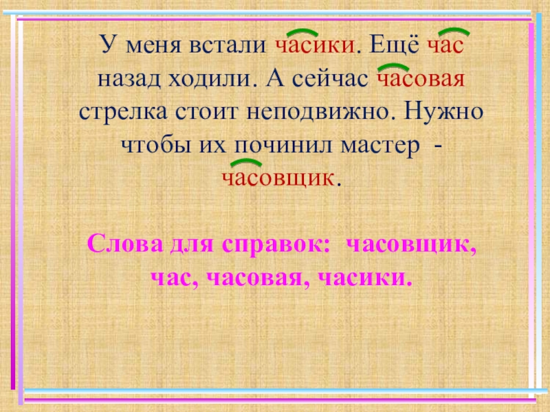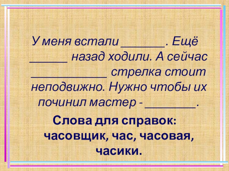 Слайд 12У меня встали часики. Ещё час назад ходили. А сейчас часовая