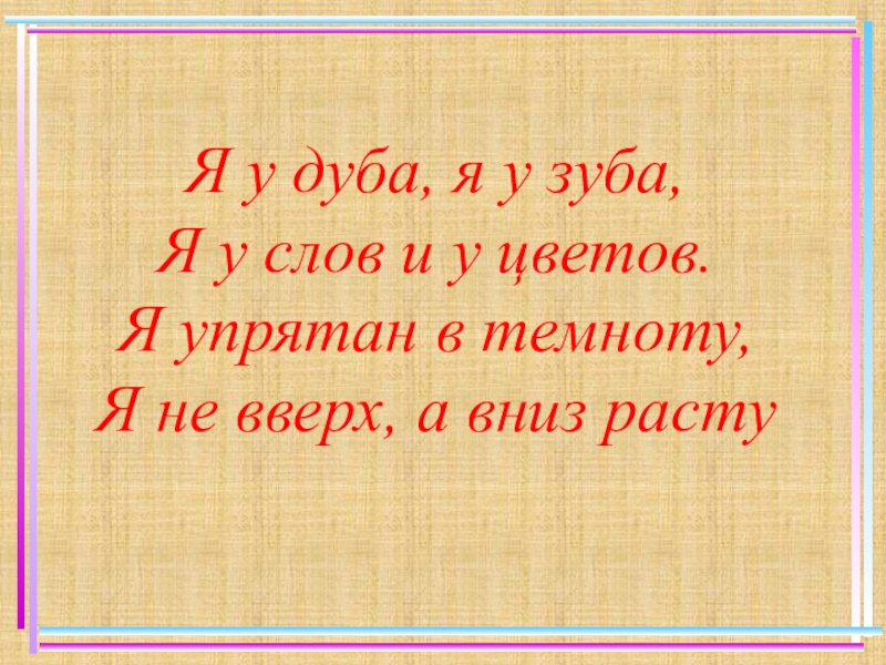 Я у дуба, я у зуба, Я у слов и у цветов. Я упрятан в темноту, Я не вверх, а вниз расту