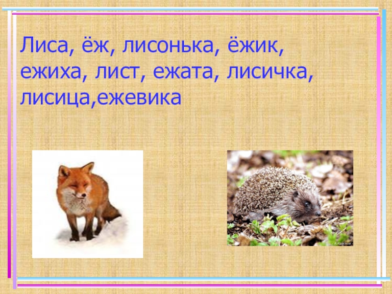 Слайд 10Лиса, ёж, лисонька, ёжик, ежиха, лист, ежата, лисичка, лисица,ежевика