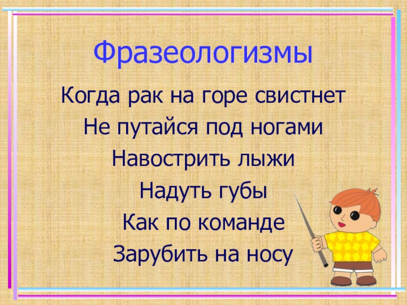 ФразеологизмыКогда рак на горе свистнетНе путайся под ногамиНавострить лыжиНадуть губыКак по командеЗарубить на носу