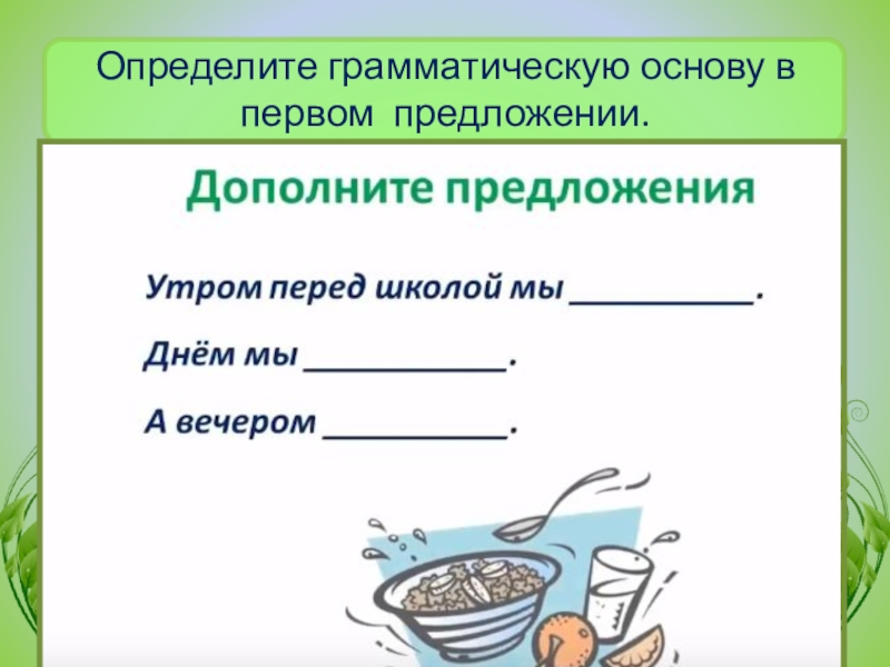 Слайд 8Определите грамматическую основу в первом предложении.