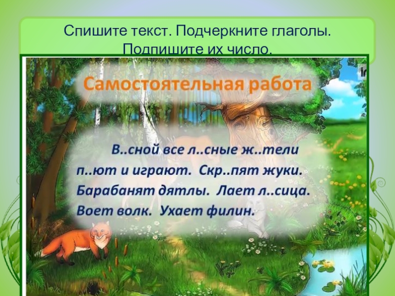 Слайд 50Спишите текст. Подчеркните глаголы. Подпишите их число.