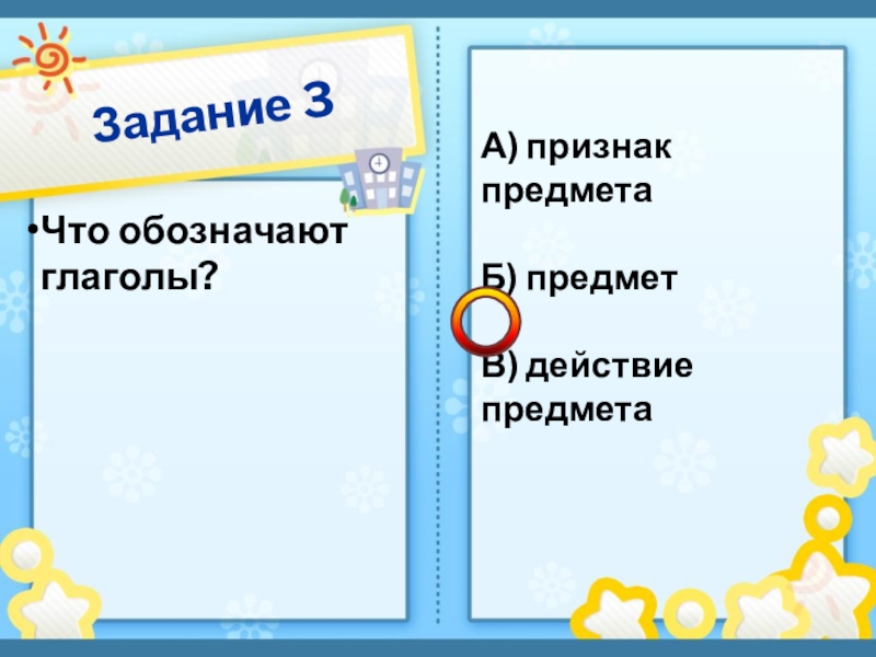 Задание 3Что обозначают глаголы?А) признак предметаБ) предмет В) действие предмета