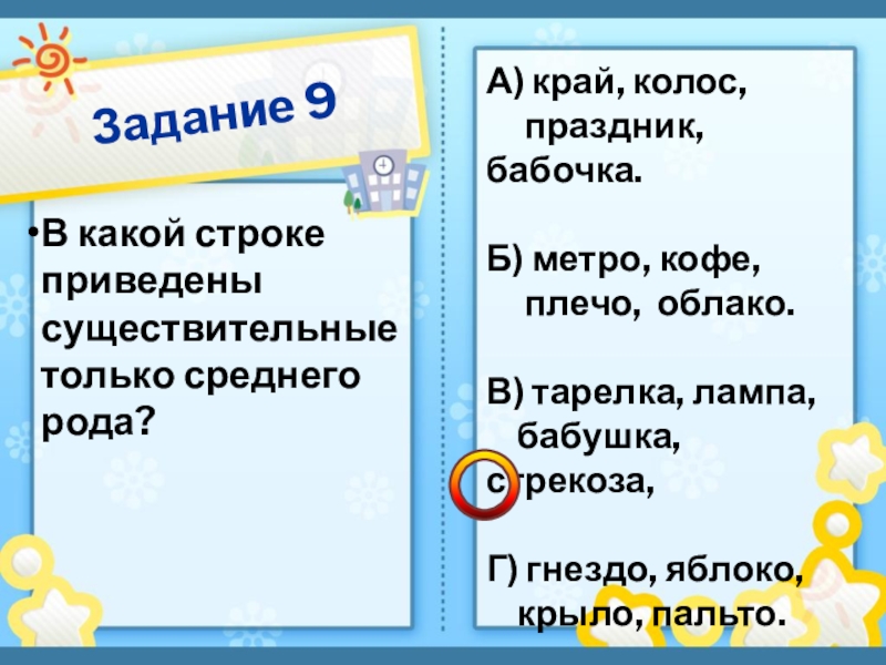 Задание 9В какой строке приведены существительные только среднего рода?А) край, колос,    праздник, бабочка. Б)