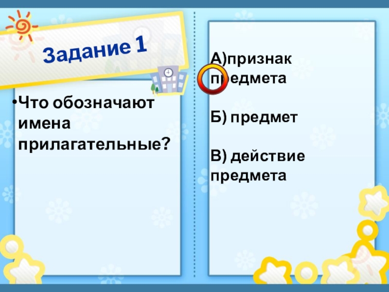 Задание 1Что обозначают имена прилагательные?А)признак предметаБ) предметВ) действие предмета
