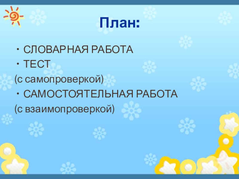 План:СЛОВАРНАЯ РАБОТАТЕСТ (с самопроверкой)САМОСТОЯТЕЛЬНАЯ РАБОТА (с взаимопроверкой)