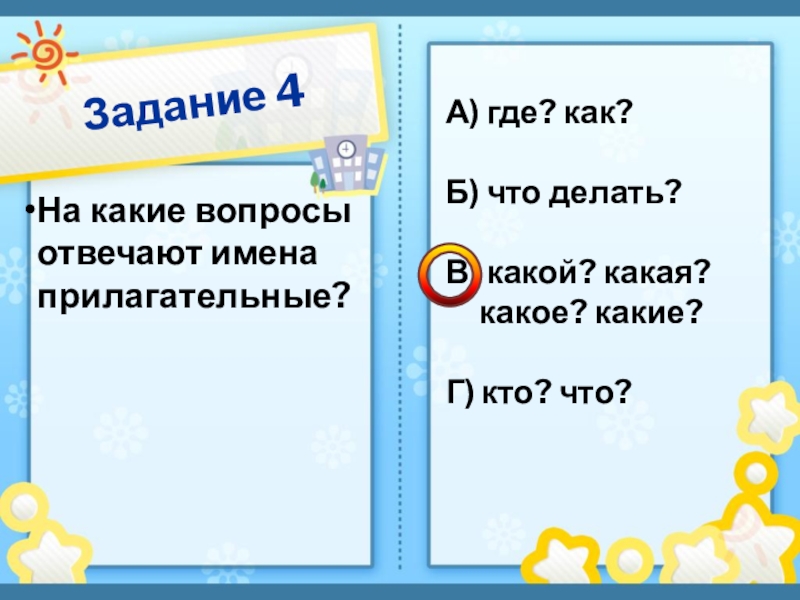 Задание 4На какие вопросы отвечают имена прилагательные?А) где? как? Б) что делать? В) какой? какая?
