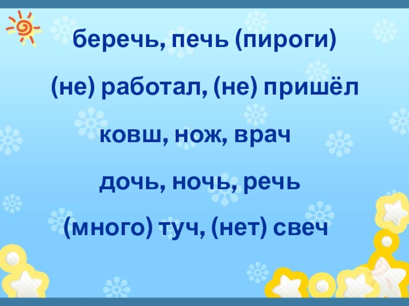 беречь, печь (пироги)(не) работал, (не) пришёл ковш, нож, врачдочь, ночь, речь(много) туч, (нет) свеч