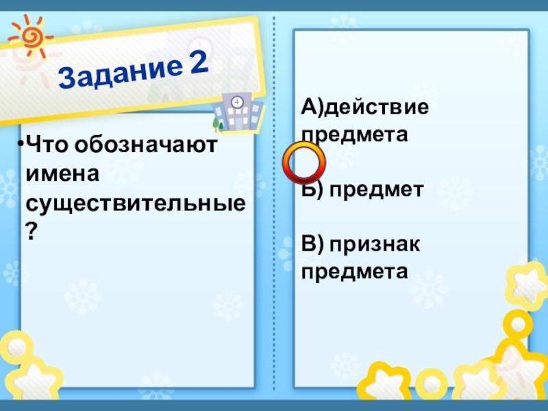 Задание 2Что обозначают имена существительные ?А)действие предмета Б) предмет В) признак предмета
