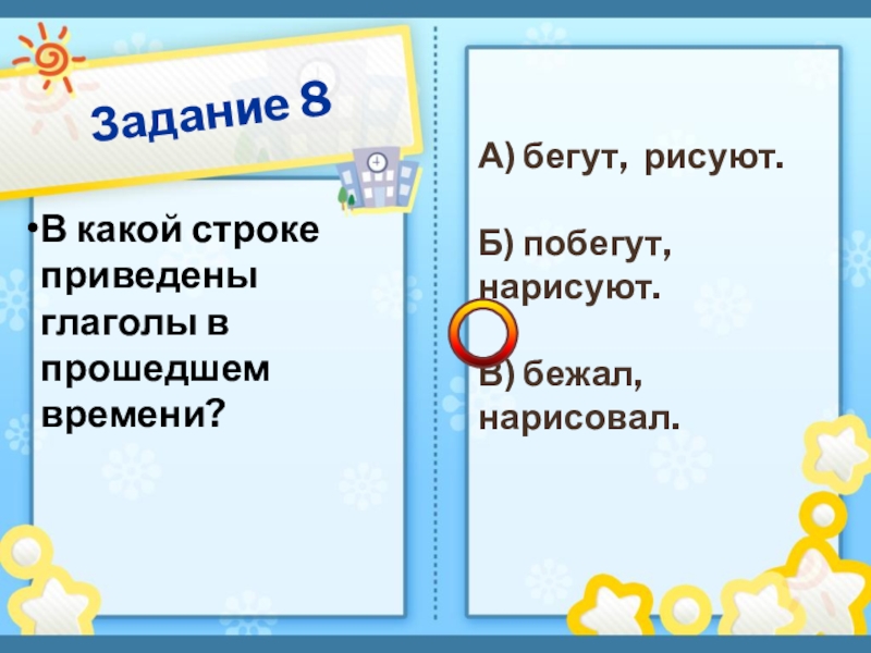 Задание 8В какой строке приведены глаголы в прошедшем времени?А) бегут, рисуют.Б) побегут, нарисуют.В) бежал, нарисовал.