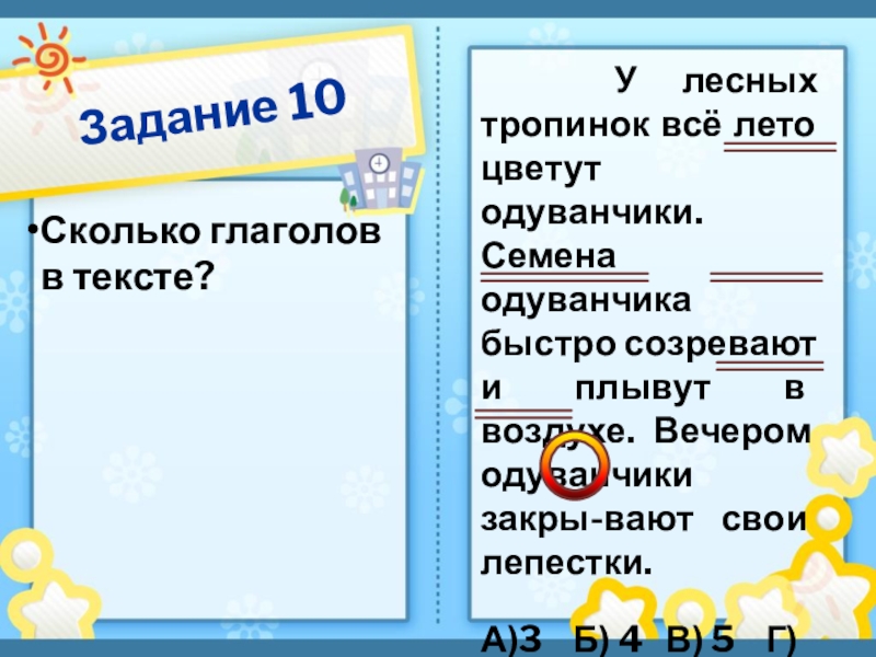 Задание 10Сколько глаголов в тексте?  У лесных тропинок всё лето цветут одуванчики. Семена одуванчика быстро созревают