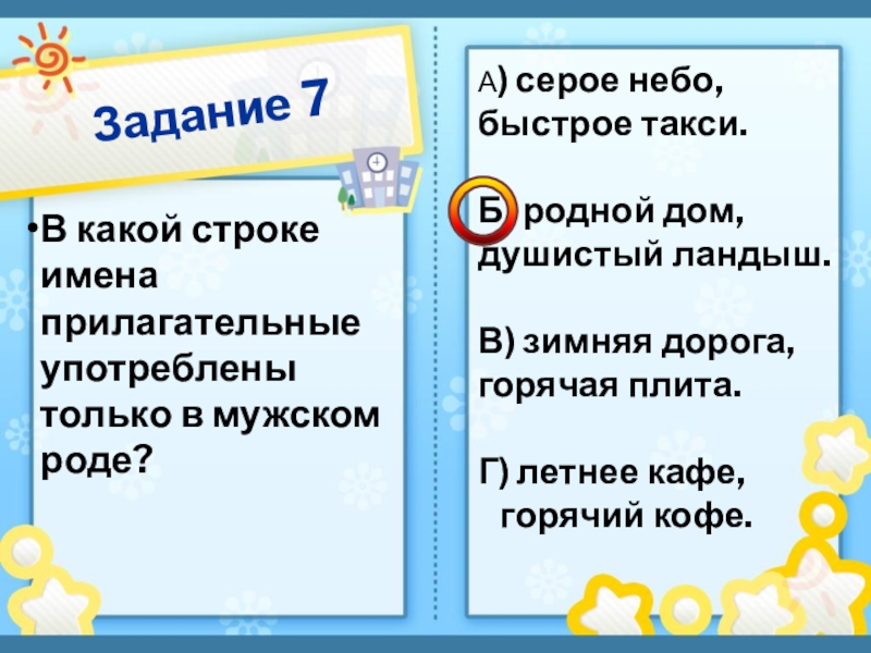 Задание 7В какой строке имена прилагательные употреблены только в мужском роде?А) серое небо, быстрое такси. Б) родной